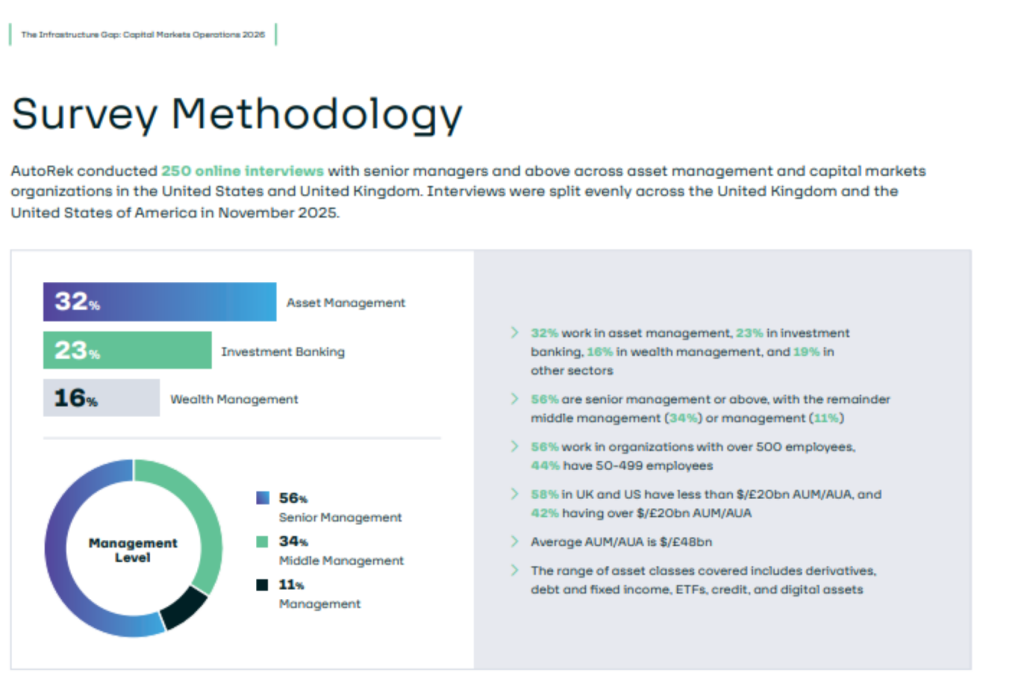 This report explores the operational reality behind capital markets’ 2026 transformation. Through five interconnected mega trends, it examines why infrastructure, not strategy, is becoming the defining constraint on growth, resilience, and regulatory readiness. To do so, AutoRek conducted 250 online interviews with senior managers and above across asset management and capital markets organizations in the United States and United Kingdom.